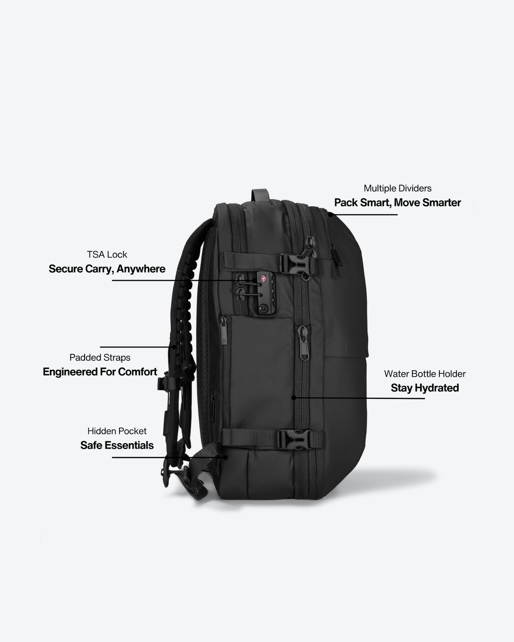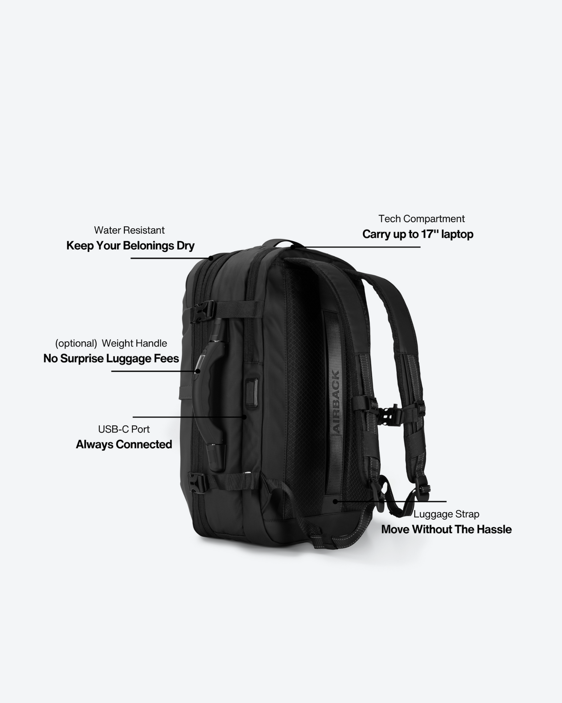 The Airback® Original is the groundbreaking travel bag from the inventors of the viral Kickstarter backpack, combining style, innovation, and functionality. Featuring Airback® compression technology, it fits 25+ clothing items with ease while staying carry-on approved. An integrated weight handle prevents airline overweight fees, while the TSA-approved lock keeps your belongings secure. The padded laptop compartment, USB-A/USB-C charging ports, and dedicated water bottle holder make it ideal for business or leisure. Multiple compartments ensure perfect organization, and the expandable design adds extra space when needed. Crafted from premium, durable materials, the Airback® Original is built to travel anywhere in comfort and style.