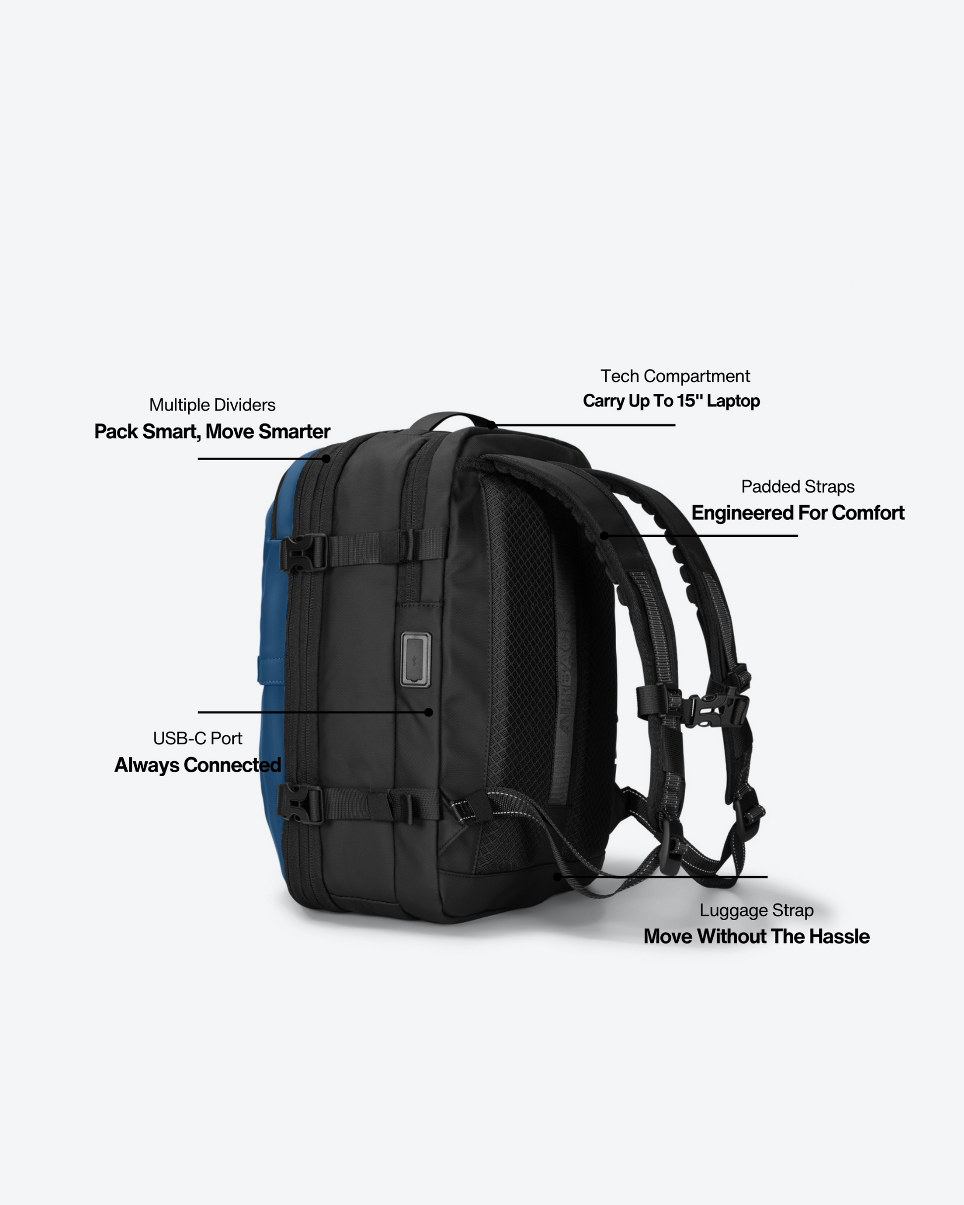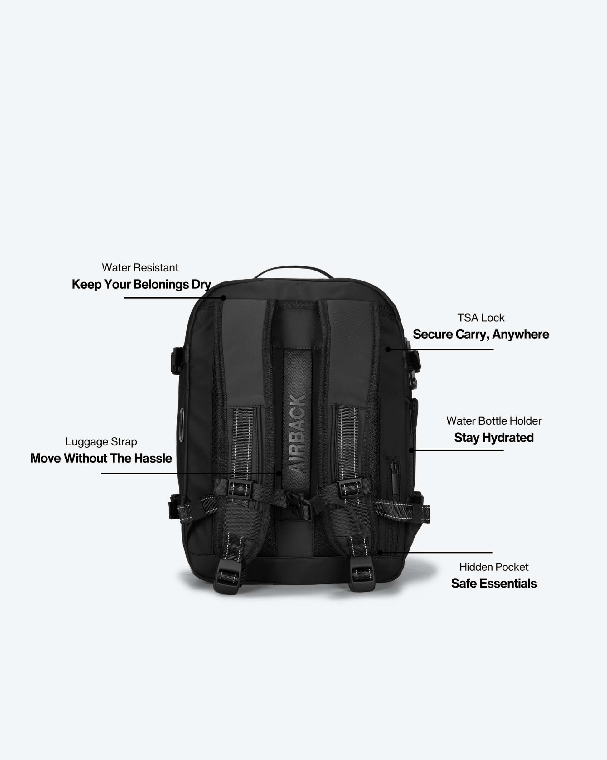 The Airback® GO is the ultimate under-seat travel companion, designed to help you skip airline baggage fees while keeping essentials within reach. With Airback® compression technology, it fits 15+ clothing items in its compact frame. An odor-free compartment keeps shoes or laundry fresh, while the expandable zipper offers extra space when needed. Featuring a built-in water bottle holder, TSA-approved lock, and durable water-resistant materials, the Airback® GO combines convenience, security, and style for both short trips and everyday use.